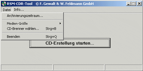 Die Applikation RSM-CDR-Tool dient zur Archivierung der Messdaten auf CD-ROM. Dieses sollte etwa vierteljährlich erfolgen. Eine CD-R mit 750MB kann etwa die Meßdaten eines Monats aufnehmen. Die Software sorgt automatisch für eine optimale Ausnutzung der CD, wobei immer nur volle Tage archiviert werden.