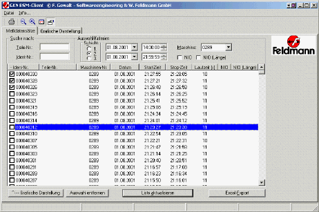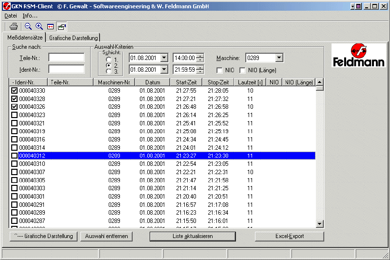 Unter Suchen nach kann die Liste auf eine bestimmte Teile-Nr. des BDE-Systems eingeschränkt oder nach einer bestimmten Ident-Nr. gesucht werden, die für jede produzierte Welle einmalig ist. Weiterhin kann sie über die Auswahl-Kriterien eingeschränkt werden. So können z.B. nur die Daten einer Maschine und Schicht oder nur die NIO-Teile angezeigt werden.