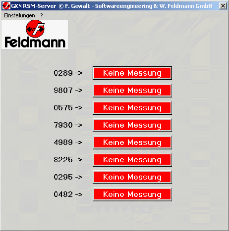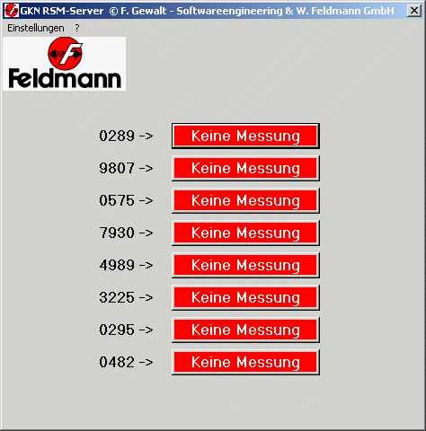 Diese Applikation stellt die Verbindung zu den Messkarten des PC's her und zeichnet automatisch alle relevanten Daten auf. Sie muß immer aktiv sein und wird beim Starten des PC's automatisch geladen.Der Meßstatus der einzelnen Maschinen wird über entsprechende Hinweisflächen angezeigt, die ihre Farbe und Bezeichnung entsprechend ändert.