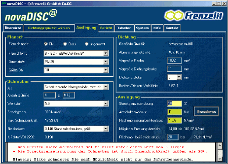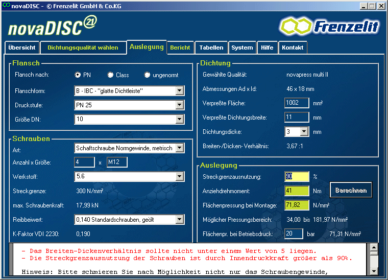 Dieses ist die Hauptberechungsmaske in die der Nutzer alle relevanten Daten für seinen dichtungstechnischen Anwendungsfall eingeben kann. Nach Wahl von Berechnen werden ihm in einem Hinweisbereich Informationen darüber gegeben, mit welchen Problemen er ggf. zu rechnen hat. Er kann seine Rahmenbedingungen dann solange ändern, bis mit keinen dichtungstechnischen Problemen mehr zu rechnen ist.