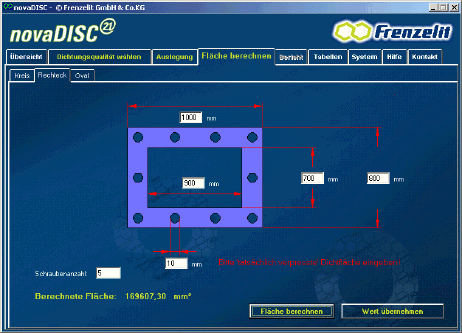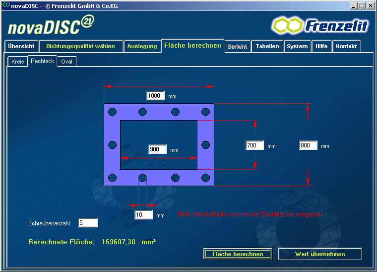 In dieser untergeordneten Maske können Flächenberechnungen für Dichtungen, die nicht der Norm entsprechen, durchgeführt werden. Die Daten werden bei Bedarf automatisch in die Dichtungsberechnungen übernommen.