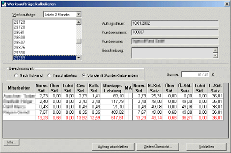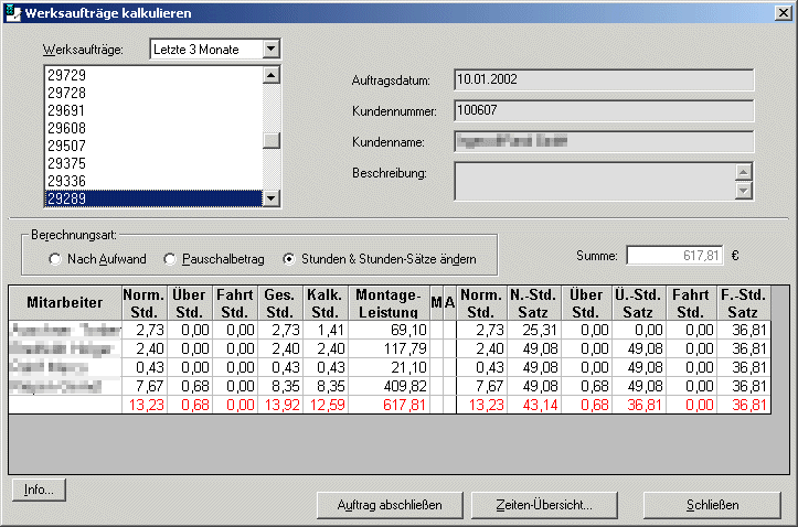 3. Die Stundenanzahl und Stundensätze können für jeden Mitarbeiter individuell eingegeben und weiterberechnet werden. Die Eingaben überschreiben dabei die hinterlegten Daten und gelten nur für diesen Auftrag.